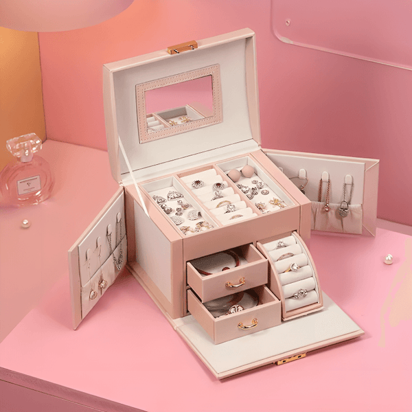 Leather 3-Tier Luxury Travel Jewelry Box with Lock and Mirror