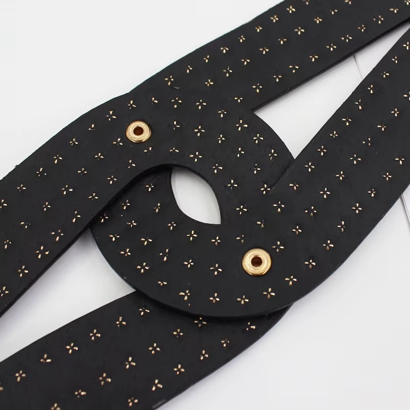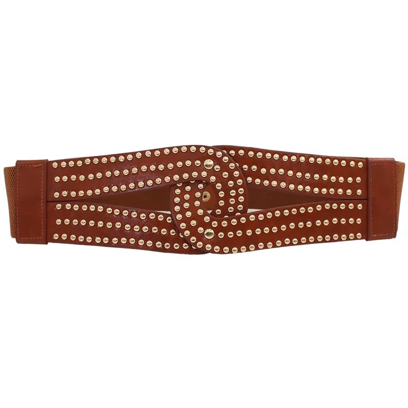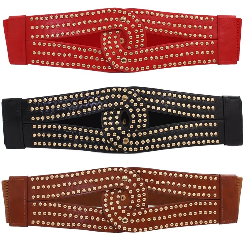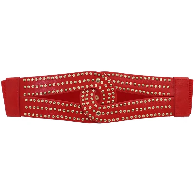 Make a bold style statement with this Designer Fashion Gold Elastic Wide Waist Belt for Women. Featuring a shiny eyelet design with stretchable elastic fabric, this girdle-style belt is perfect for nightclubs, parties, and fashion-forward outfits. Available in black, red, and tan, it adds a glamorous touch to any dress or ensemble.